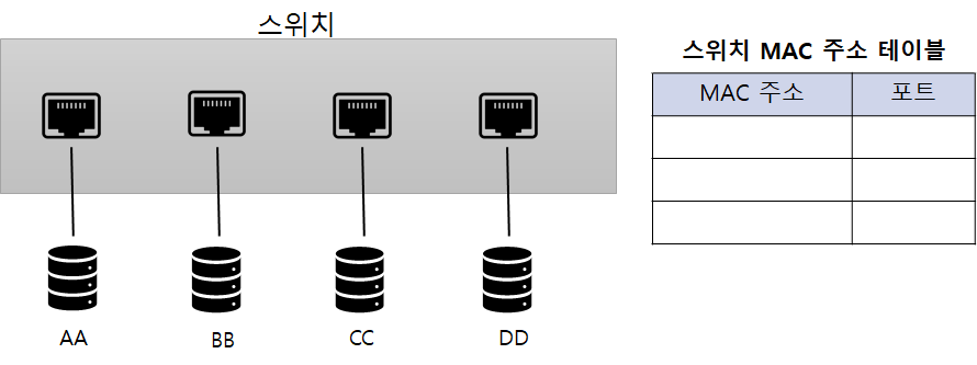 스위치는 단말이 어떤 MAC 주소인지, 연결된 포트는 어느 것인지 주소 습득 과정에서 알 수 있다.