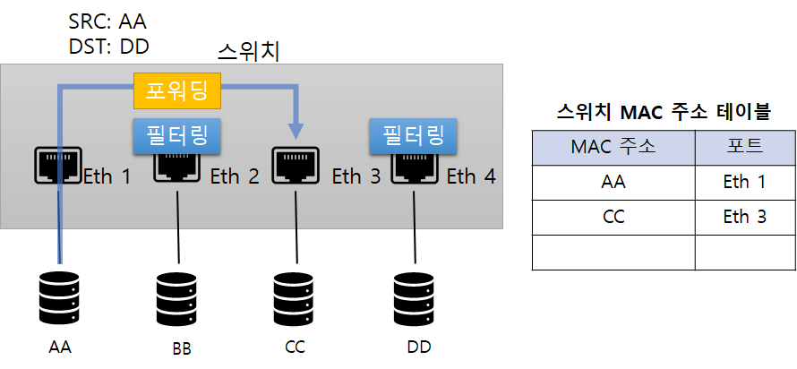 포워딩 : 패킷이 스위치에 들어왔을 때 도착지 MAC 주소를 확인 후 MAC 테이블과 비교해 맞는 정보가 있으면 해당 포트로 패킷을 넘겨주는 것