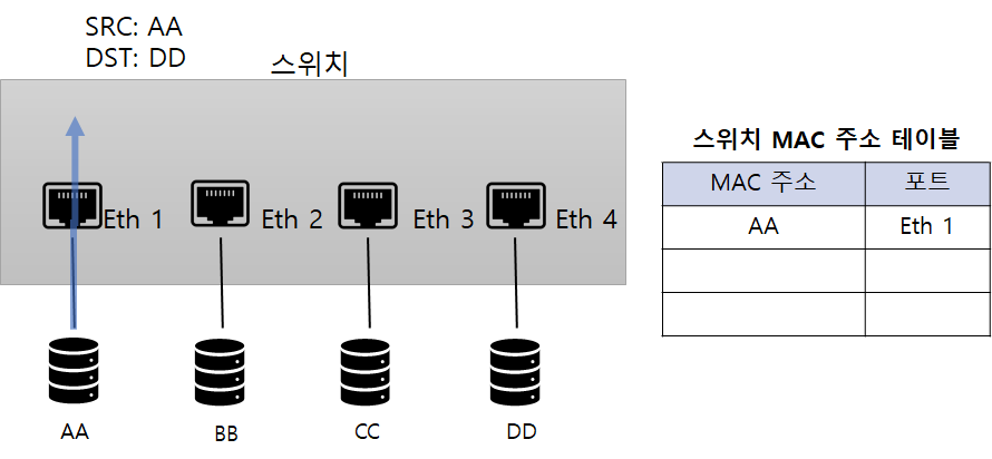 예를 들어 1번 포트에서 들어온 패킷의 출발지 MAC 주소가 AA일 경우 우리는 자연스럽게 Eth 1 포트에 AA 주소를 가진 장비가 있다고 추론할 수 있다. 이런 방법으로 주소 정보를 학습해 테이블을 작성한다.