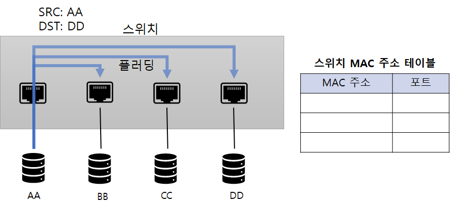 이처럼 스위치가 허브와 같이 모든 포트로 패킷을 흘리는 동작을 플러딩(Flooding)이라고 한다.