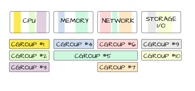 - 아래의 그림을 보자. cgroup 은 컴퓨터의 자원(CPU, 메모리, network, storage I/O)가 각 프로세스 별로 독립적으로 격리되어 할당한다.