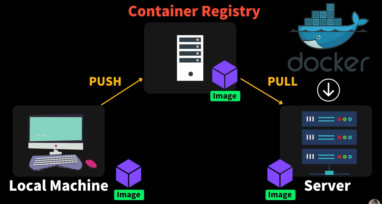 내 로컬 머신에서 이미지를 만들어서 깃허브와 같은 Container Registry라는 곳에 내가 만든 이미지를 PUSH하고 필요한 서버나 다른 개발자 PC에서 내가 만들어둔 이미지를 가지고 와서 그걸 그대로 실행하면 된다.
