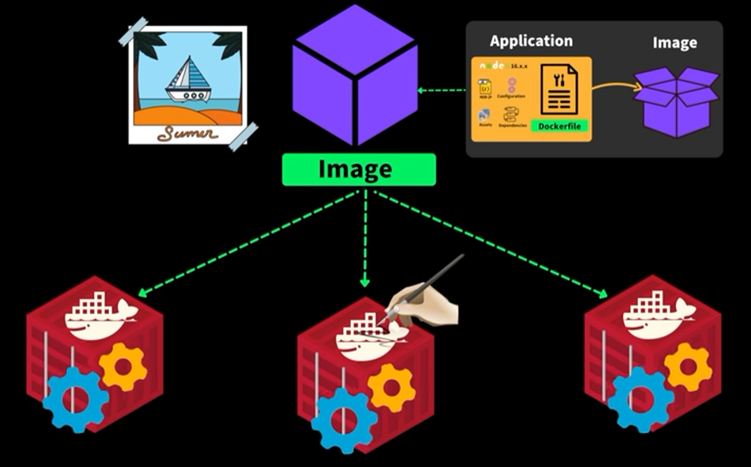 동작하고 있는 어플리케이션을 스냅샷해서 템플릿 형태로 이미지를 만들어두고 클래스(이미지)를 이용해서 실제로 어플리케이션이 동작하는 각각의 컨테이너를 만들 수 있다.