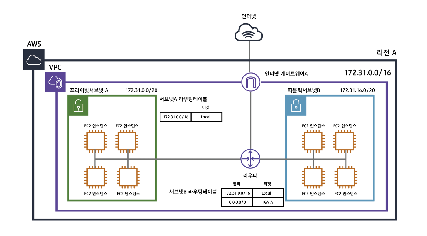 라우팅 규칙을 설정하면 네트워크 요청 발생 시 목적지의 IP 주소가 172.31.0.0/16 (VPC 내부)에 해당하는지 확인한다.