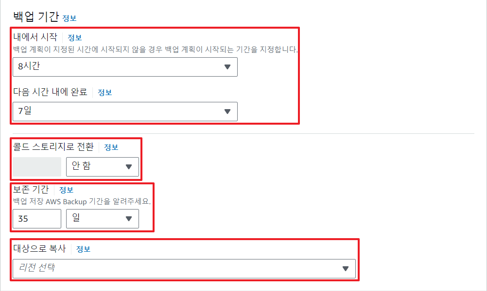 - 백업 계획의 일부로 선택적으로 다른 AWS 리전에 백업 사본을 생성할 수 있다.