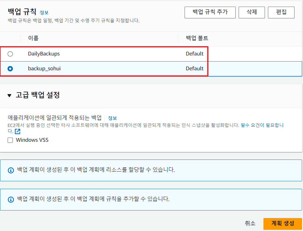 그 다음 백업 볼트를 정해야 하는데 default 백업 볼트를 사용해도 되고 새 백업 볼트를 생성하여 적용해도 된다.
