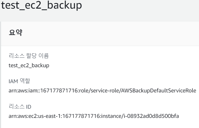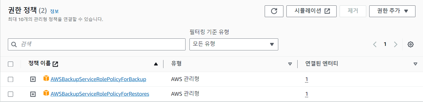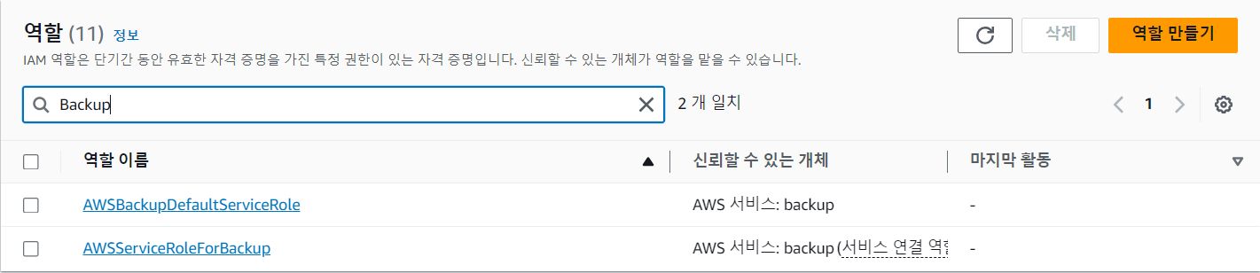 IAM 역할에서 Backup을 검색하면 AWSBackupDefaultServiceRole 과 AWSServiceRoleForBackup 이라는 두개의 역할이 나온다. 이때 Backup에 사용된 역할은 AWSBackupDefaultServiceRole 이다.