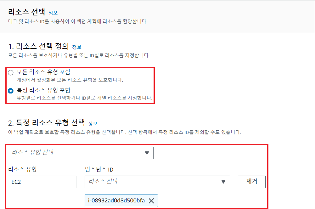 특정 리소스 유형 포함 옵션을 선택하면 S3나 EC2, RDS 등 직접 리소스 유형을 선택한 뒤 인스턴스 ID를 지정하여 Backup 설정을 할 수 있다.