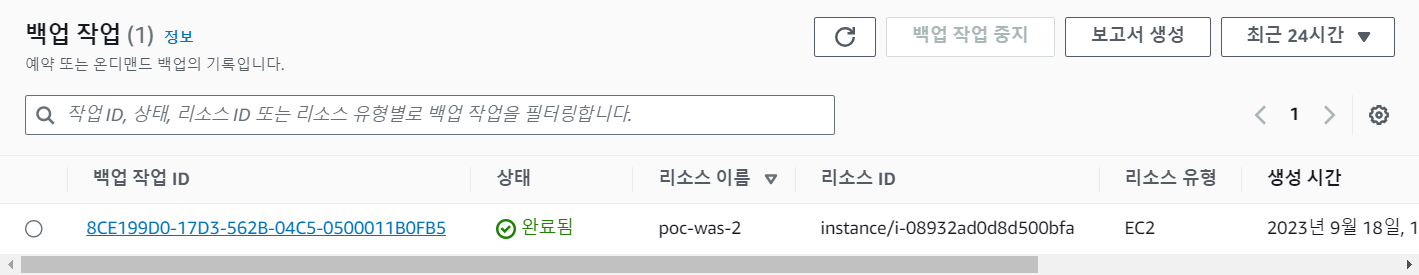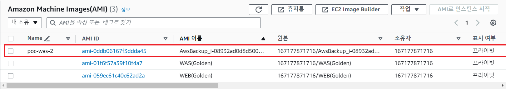 또한 AMI에서도 기존에 없던 AMI를 확인할 수 있고 AwsBackup_[인스턴스 id]라는 이름이 붙은 것을 확인할 수 있다.
