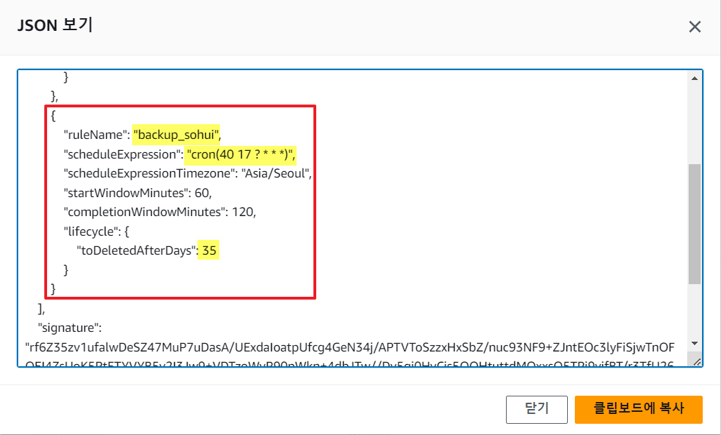 마지막으로 생성된 백업 규칙의 JSON을 확인해보자