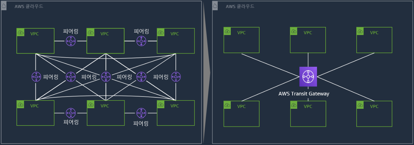 Transit Gateway는 복잡한 피어링 구조를 Hub & Spoke 구조로 단순화할 수 있는 서비스이다.