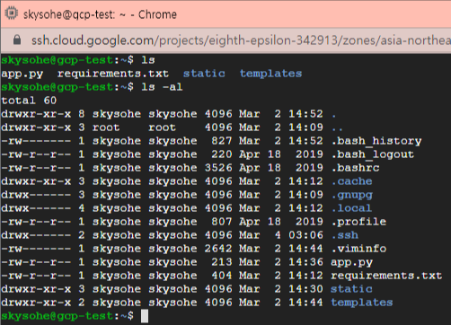 위와 같이 입력하고 ls -al 명령어를 입력하면 app.py이 생성된 것을 확인할 수 있다.