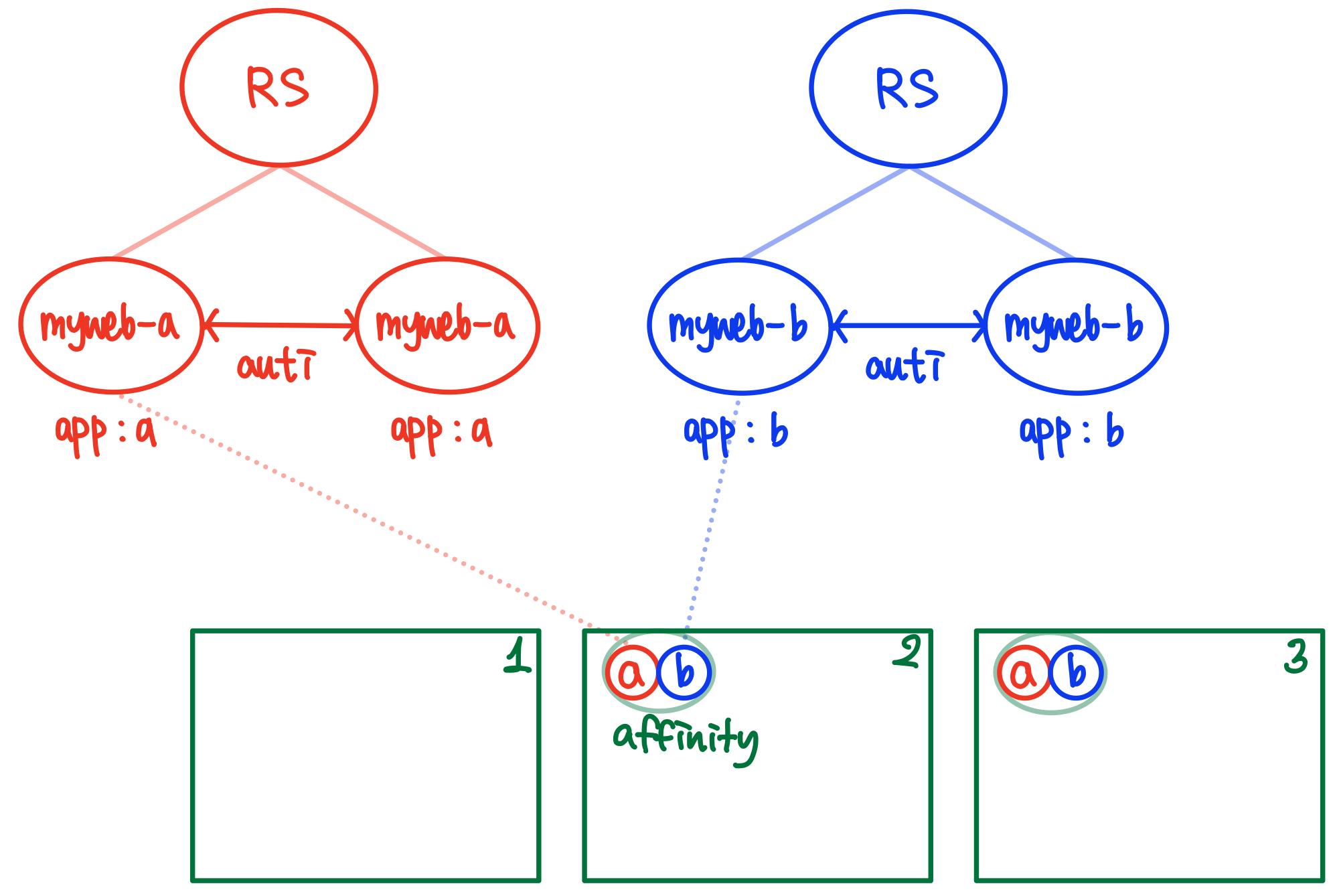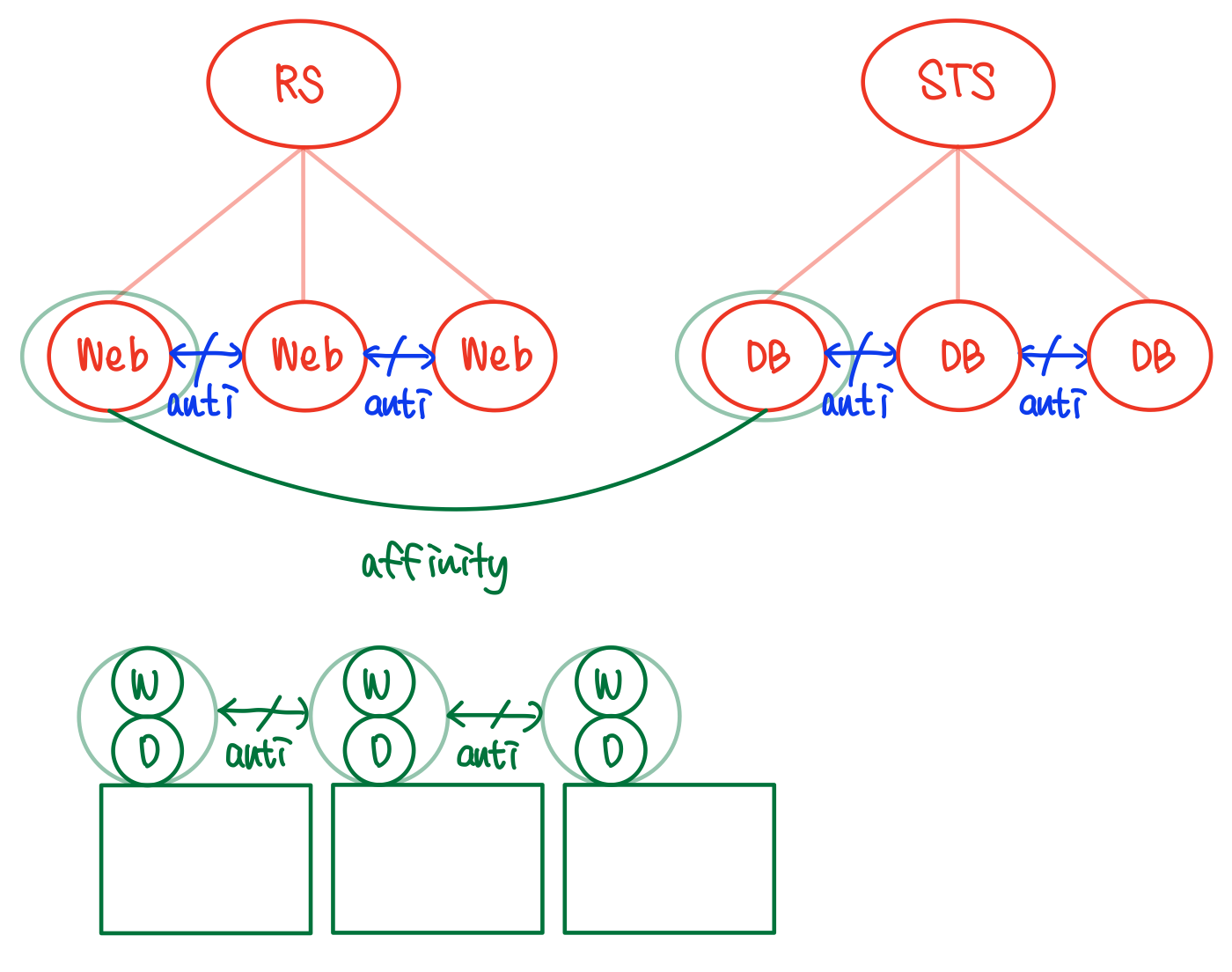 서로를 anti 하므로 같은 노드에 배치될 수 없다. 반드시 떨어져 있어야 한다.