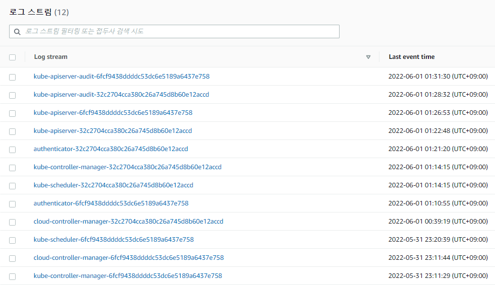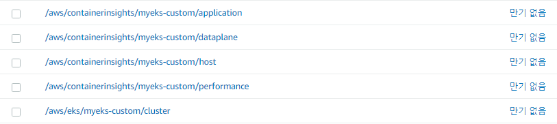 /aws/eks/myeks-custom/cluster 로그는 컨트롤 플레인의 로그이다.