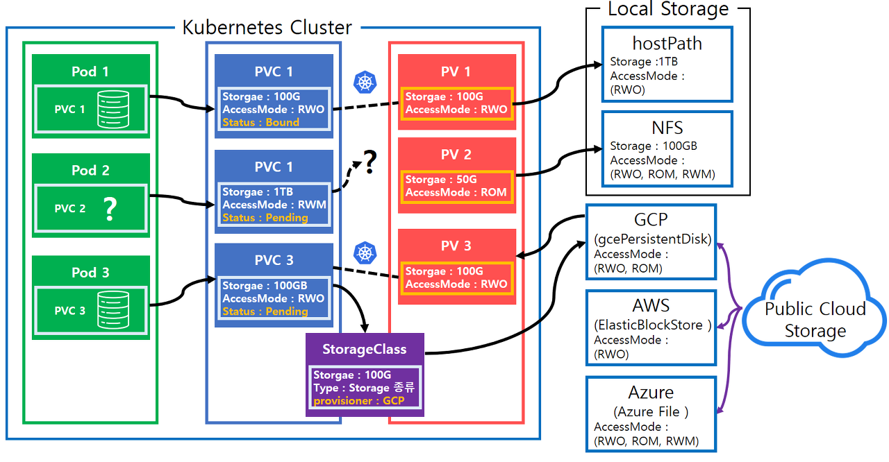 시스템 관리자가 생성한 물리 디스크를 쿠버네티스 클러스터에 표현한 것이 PV이며, Pod의 볼륨과 이 PV를 연결하는 관계가 PVC가 된다.