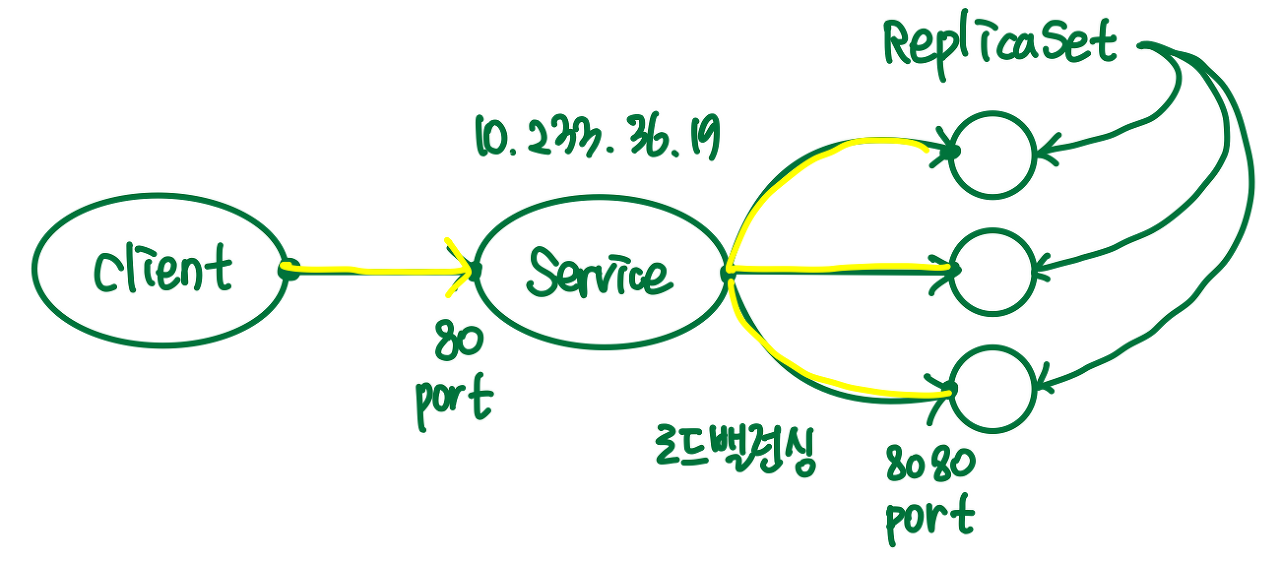 클라이언트는 해당 이름을 가지고 서비스에 접근하면 서비스는 로드 밸런서의 기능을 가지고 있으므로 트래픽을 분산해서 접근이 가능하도록 해준다.
