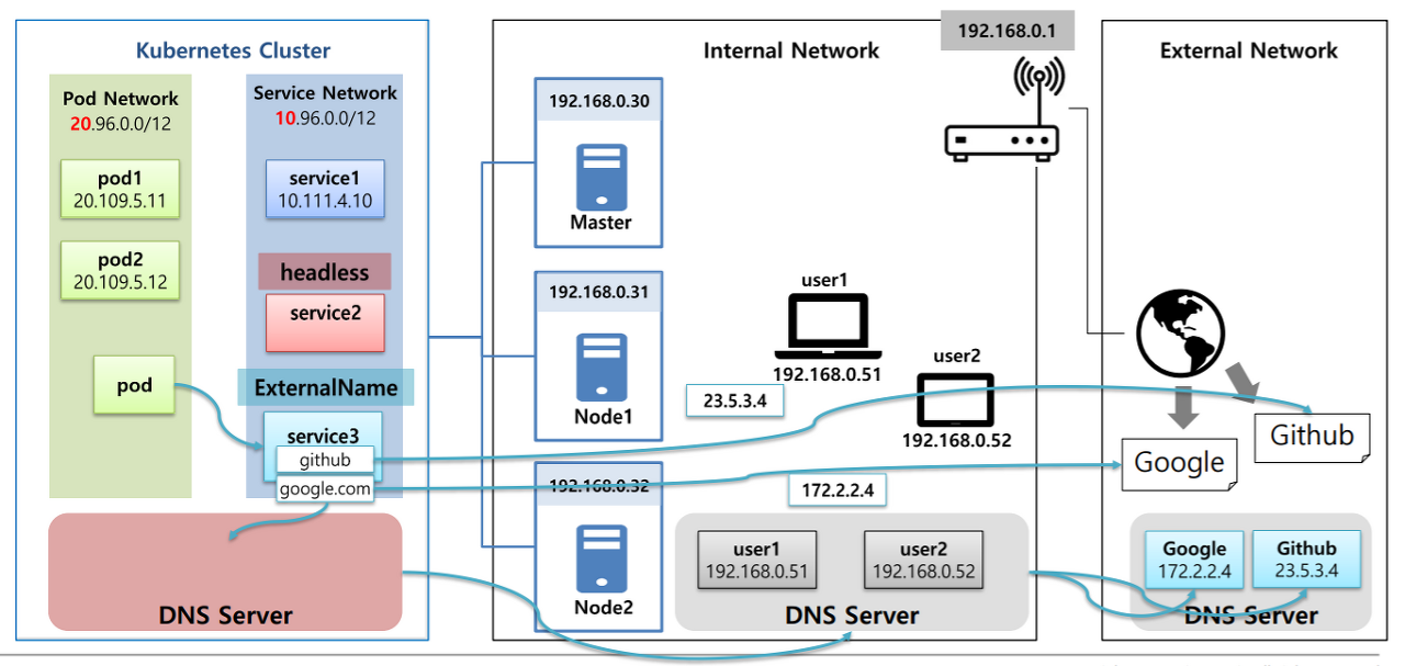 Pod가 이 Service를 통해서 데이터를 가져오도록 해놓으면 추후 데이터를 Google → Github로 변경했을 경우 Pod의 수정없이 ExternalName의 이름만 변경해주면 된다.