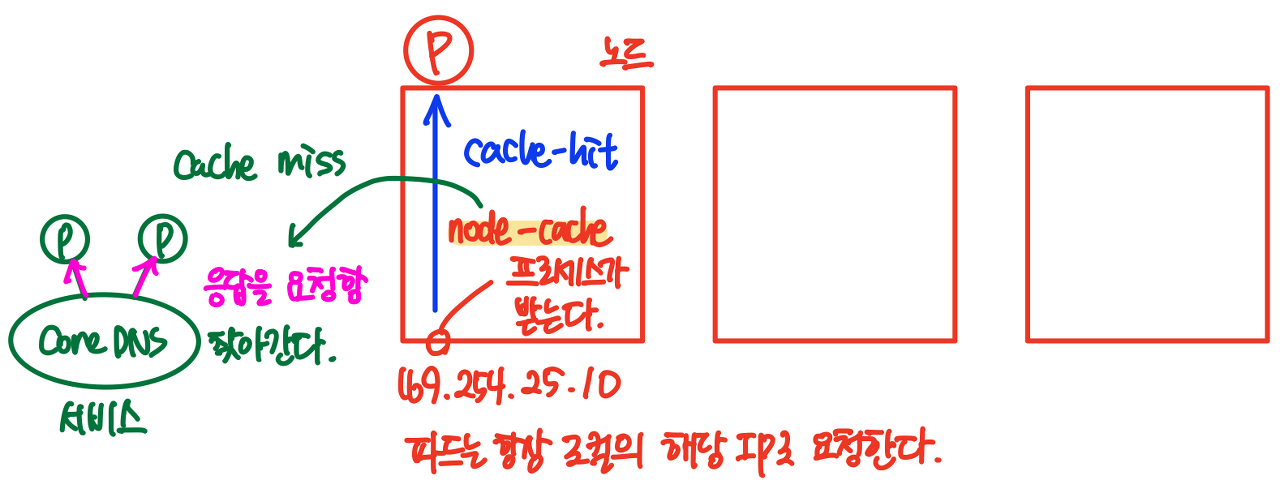 169.254.25.10:9254 node-cache라고 된 것이 있다.node-cache는 프로세스이다. 169.254.25.10:9254로 질의하면 node-cache라는 프로세스가 받는다.