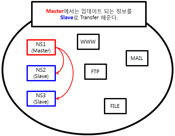 - Master와 Slave는 주, 보조 관계이며 DNS 서버를 이중화한다. (여러대의 slave를 사용할 수도 있다.)