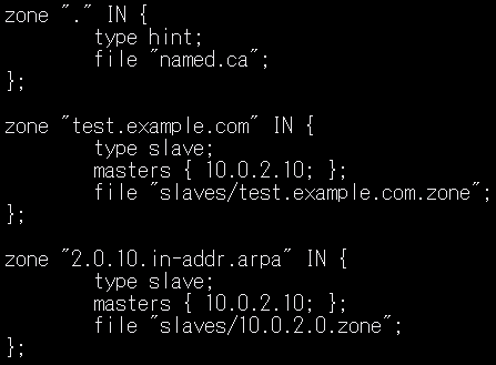 - Master/Slave 구조에서 Data가 동기화되는 것은 zone database만 가능하다. named.conf에서 변경되는 내역은 slave에 반영되지 않는다.