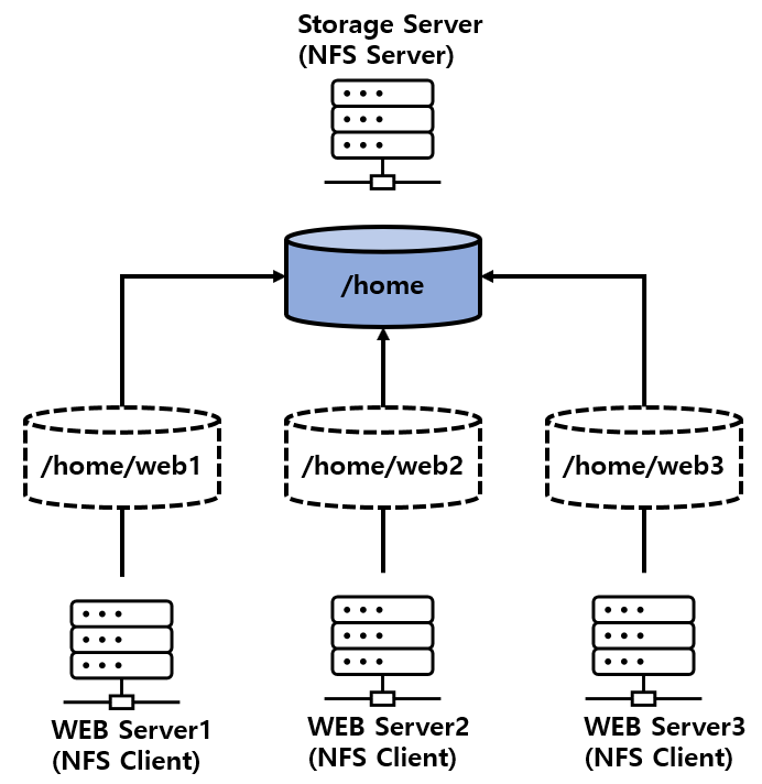 NFS란 스토리지 서버와 일반(Web, DB) 서버들이 네트워크를 통해 저장 공간을 공유하는 프로세스이다.