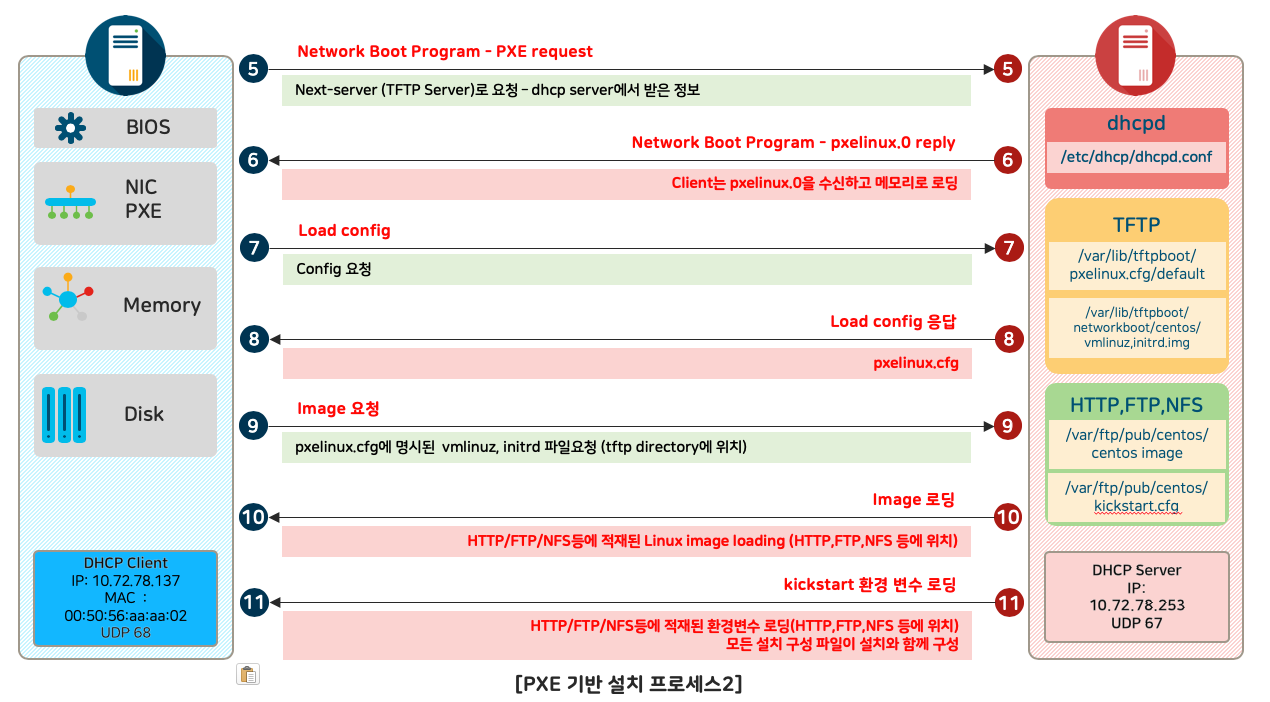 5. 클라이언트는 DHCP 수신 정보 가운데, TFTP 서버 정보를 보고 NBP(Network Boot Program)으로 PXE 요청을 TFTP 서버에게 보낸다.