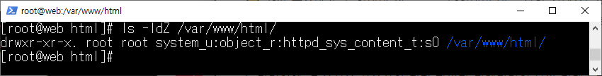 먼저 웹 컨텐츠를 제공하는 /var/www/html 를 확인해 보면 다음처럼 system_u 라는 사용자와 object_r 이라는 역할, httpd_sys_content_t라는 타입을 갖고 있다.