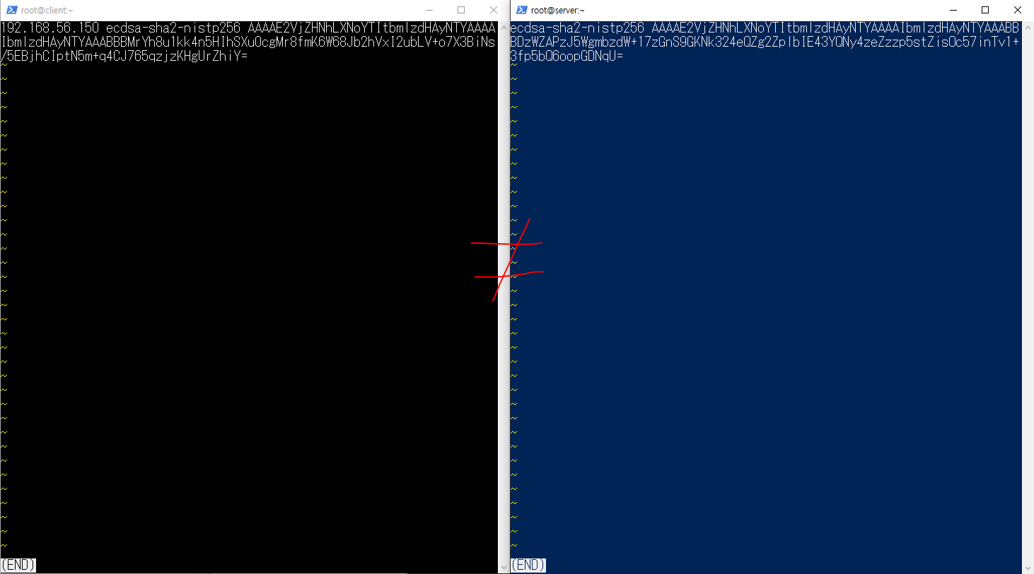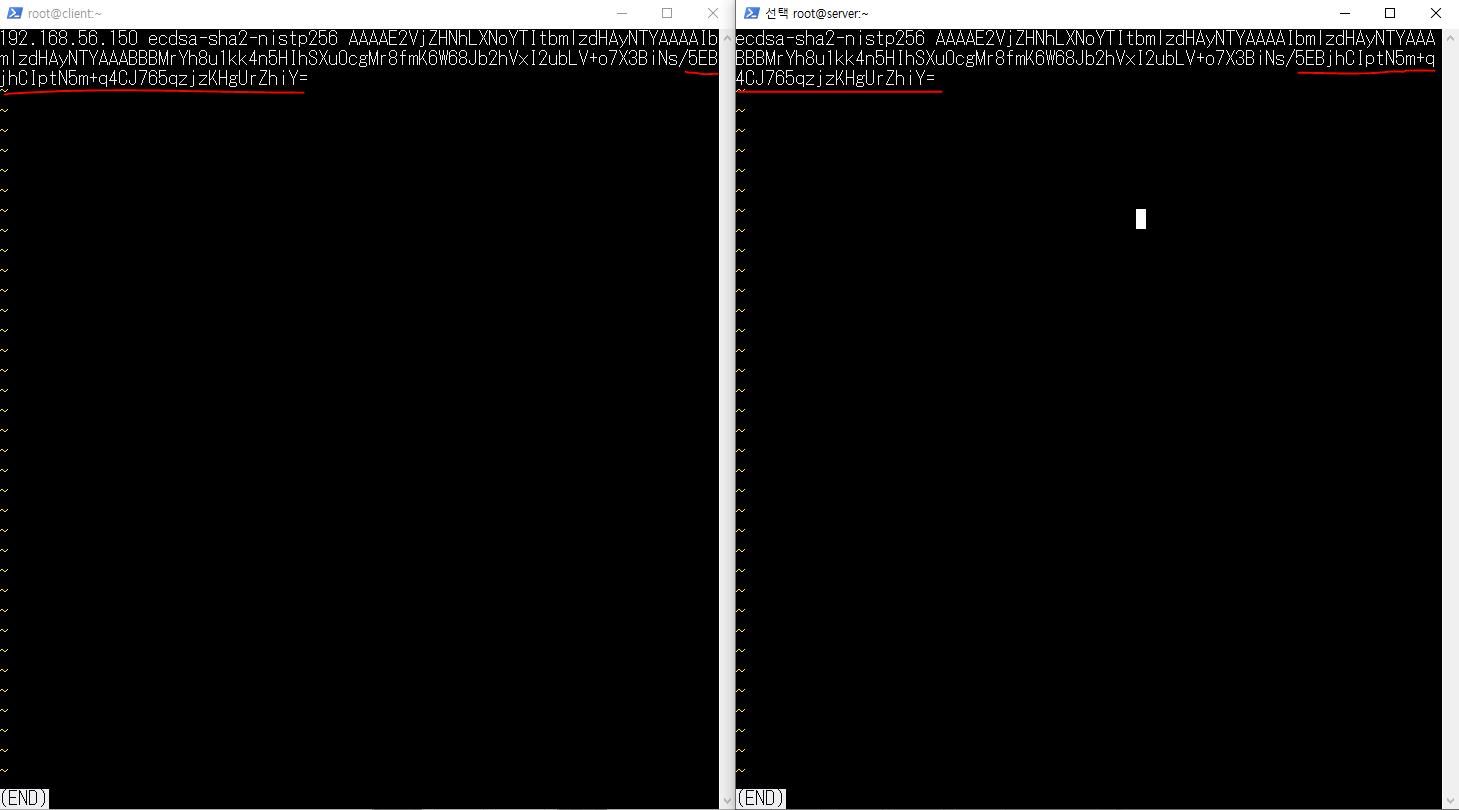 client, server의 ssh_host_ecdsa_key.pub 파일을 열어 확인해보면 공개키가 일치하는 것을 확인할 수 있다.