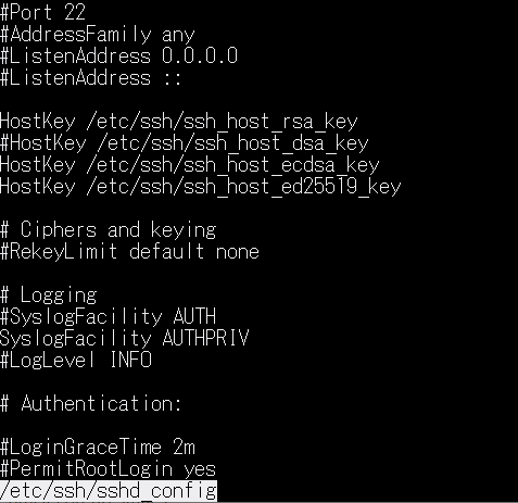 설치되어 있는 ssh의 기본적인 설명 포트번호와 함께 명령어의 PATH 경로가 나타나 있고 RSA, DSA 등 암호화 방식에 관한 설명과 log 기록 방법 등을 설정할 수 있다.