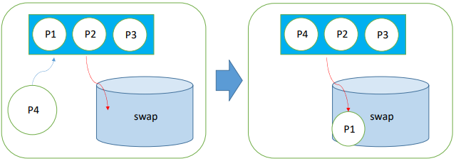 - 현재 메모리에 P1, P2, P3 사용 중이고 메모리는 모두 사용 중이며 새로운 P4를 메모리에 올려야 한다고 가정하자
