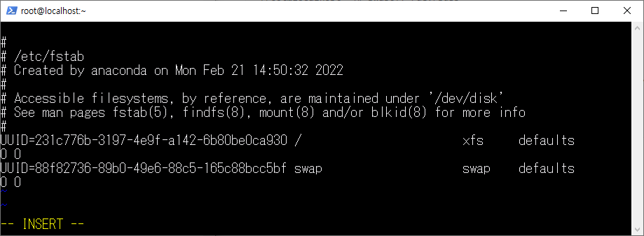 vi 편집기를 열어 순서대로 UUID, swap, swap, defaults, 0, 0을 입력한다.