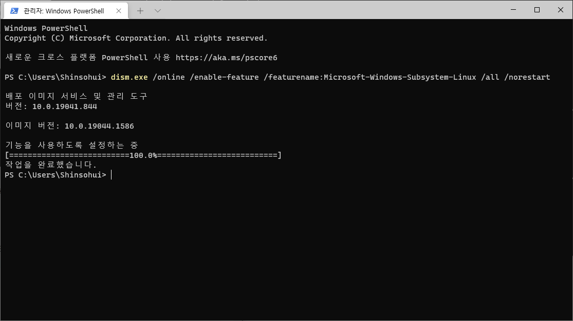 3. wsl2 활성화 명령어 실행