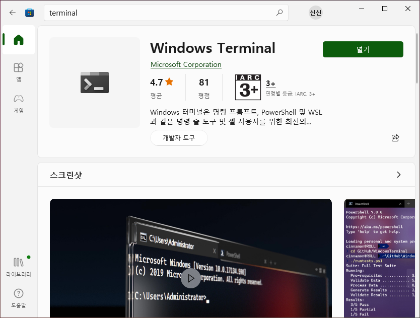 윈도우 cmd는 UI나 사용이 다소 불편하나 Micro Store에서 Windows terminal을 제공한다.