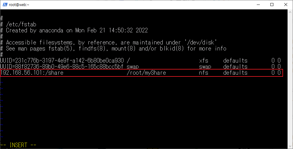 NFS 서버에서 설정한 공유 디렉토리를 NFS 클라이언트에서 사용하기 위해 사용되는 파일이며, 설정 후 부팅하면 자동으로 클라이언트 시스템에 마운트된다.